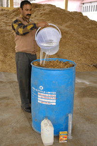 in case of paddy straw at 85C for 30-45 minutes. After draining excess water spawn is added. The leached water contains a lot of soluble sugars and phenolic compounds. Hot water treatment makes the